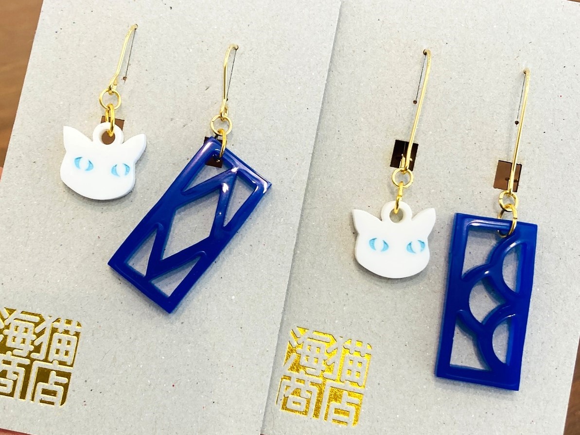 沖縄生まれのかわいい花ブロックと猫が、耳元でひらひらと揺れる可愛いピアスになりました。