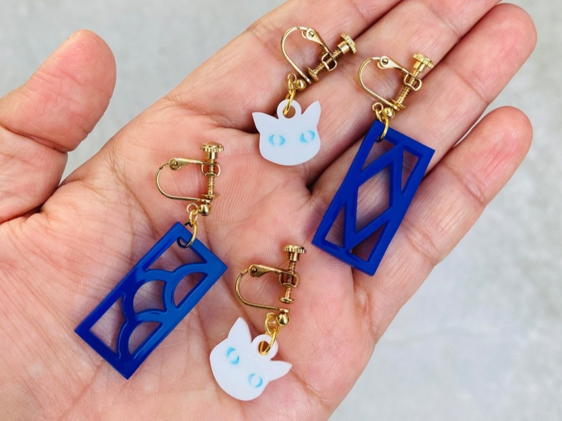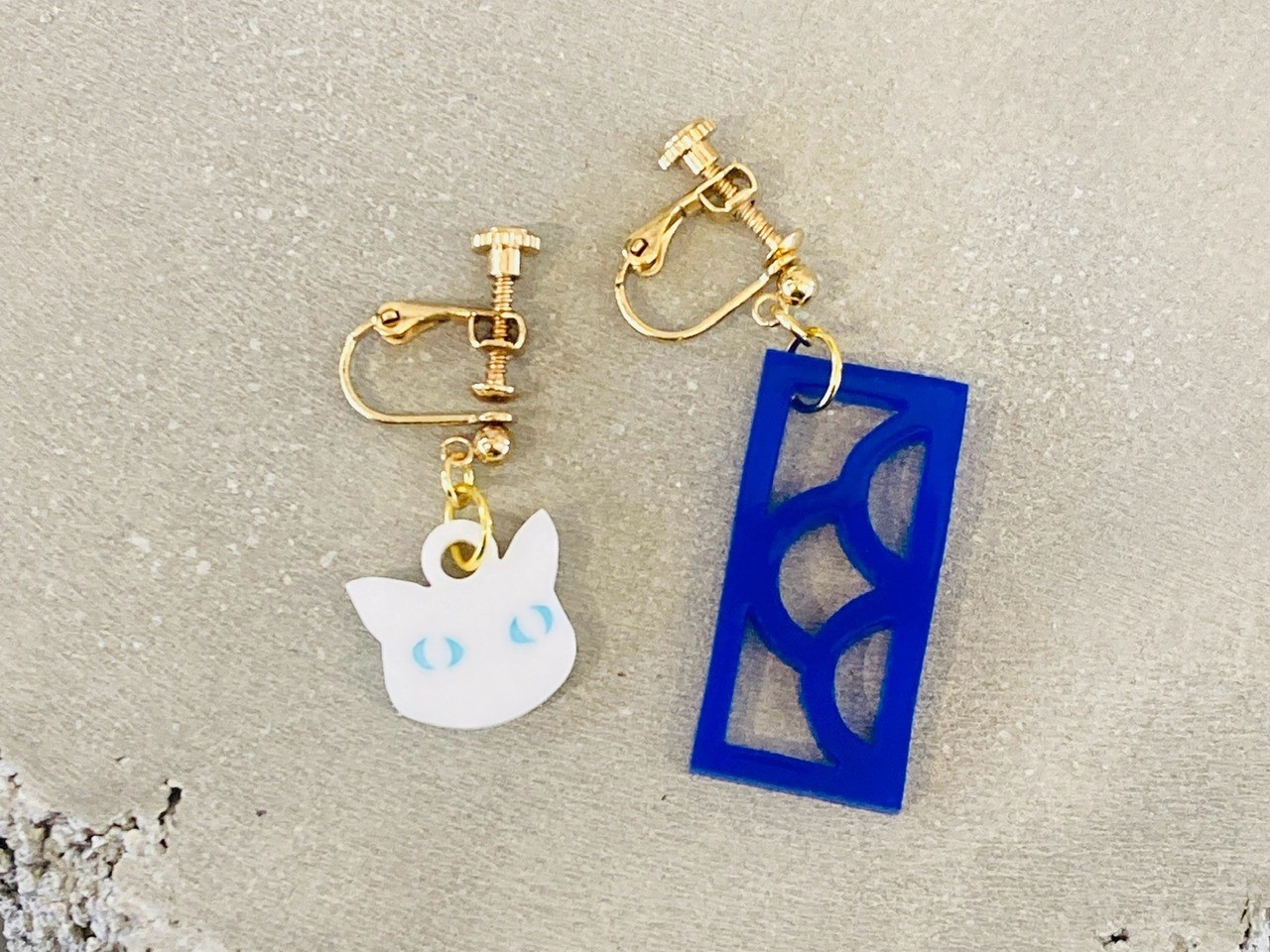 沖縄生まれのかわいい花ブロックと猫が、耳元でひらひらと揺れる可愛いイヤリングになりました。