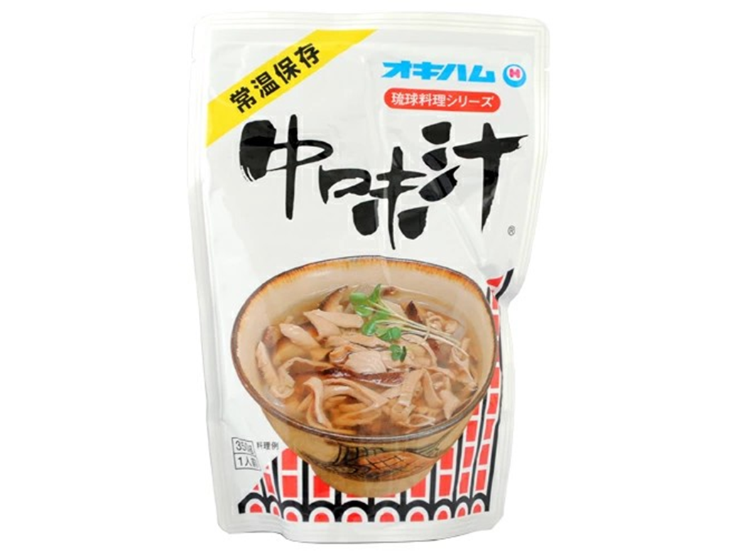 沖縄のお祝いにかかせない「中味汁」は、豚モツを柔らかくじっくり煮込んだお吸い物です。子供から大人まで人気のあるオキハム特製の深い味わいの中味汁です。