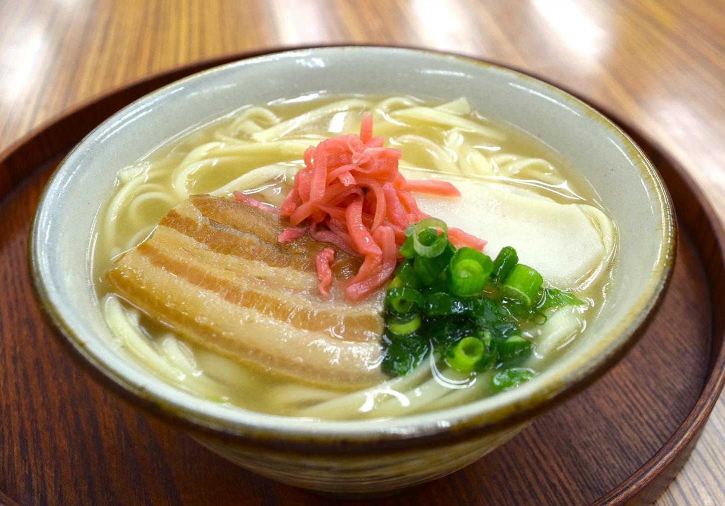 甘辛く煮たソーキ(豚の骨付きあばら肉)や三枚肉(豚バラ肉)、かまぼこ、ねぎなどをのせた沖縄では頻繁に食べられている沖縄そばは、そばに蕎麦粉が使われておらず、小麦粉100%で作られています。