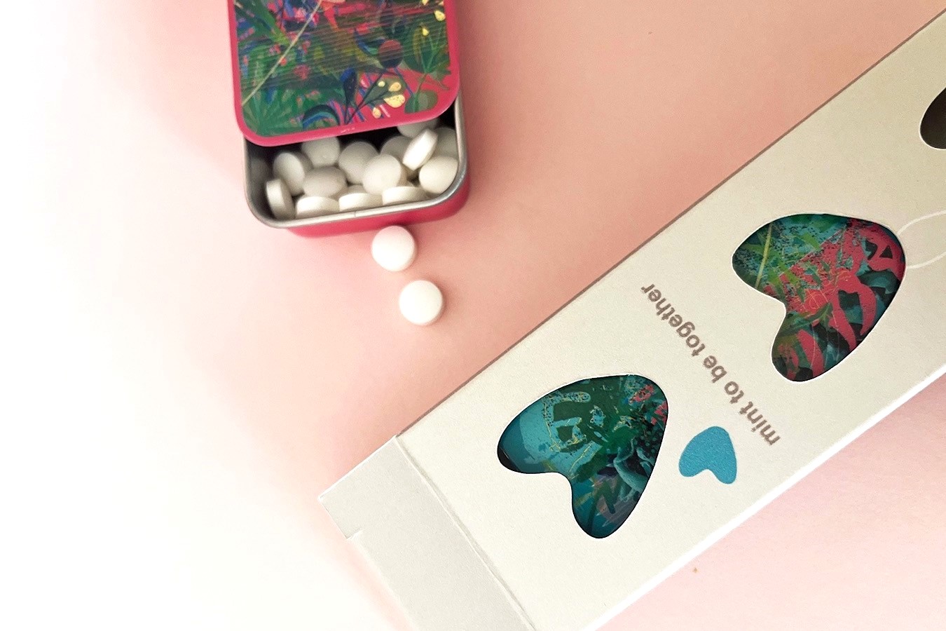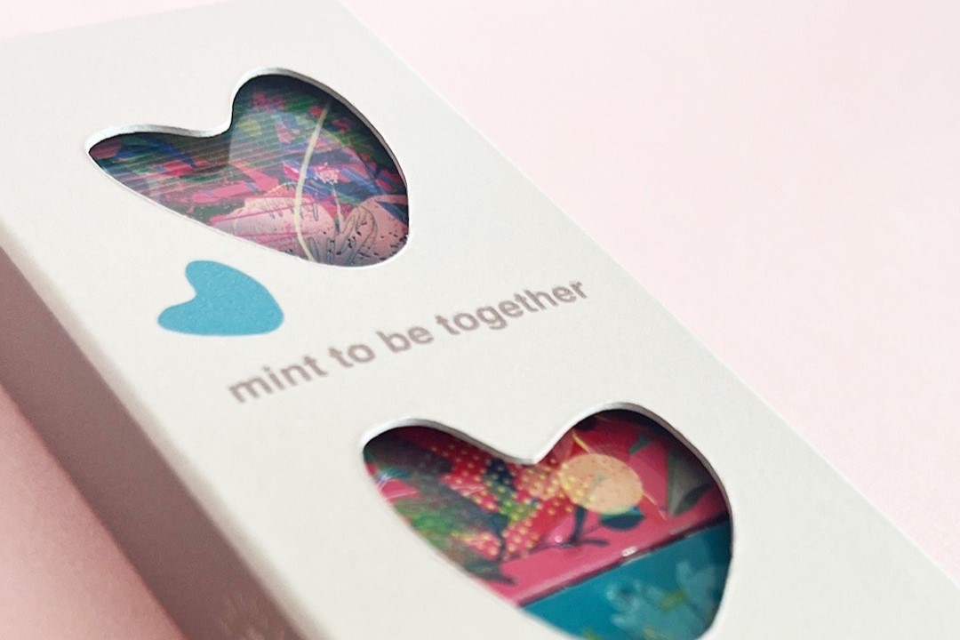 ミント缶2つがぴったり入る外箱には『mint to be together』の文字。