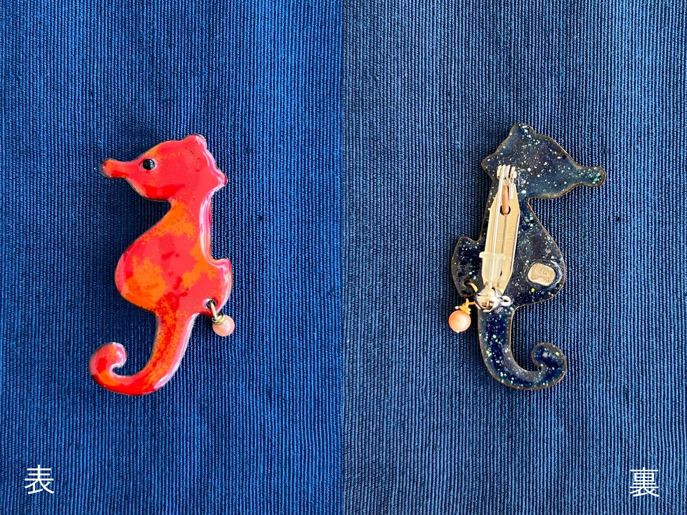 鮮やかな赤が印象的なタツノオトシゴのピンブローチです。かわいらしいフォルムが特徴で、特に辰年の方にぴったりです。七宝焼の技法で仕上げられており、光の角度によって美しい色合いが楽しめます。