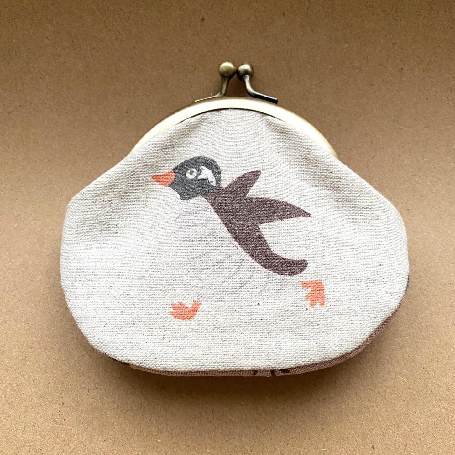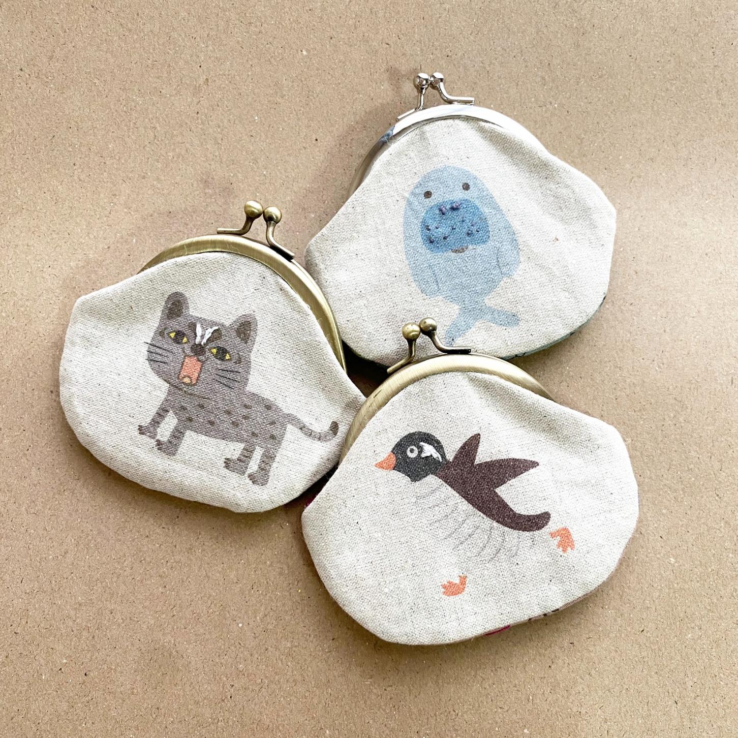 ヤンバルクイナやイリオモテヤマネコの愛らしいイラストが描かれた、ナチュラルで優しい雰囲気のがま口ポーチ。