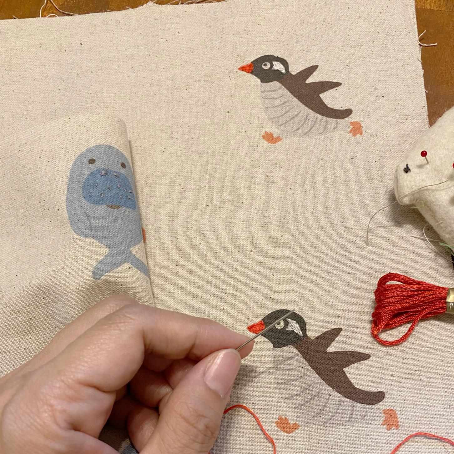 ユニークなイラストが散りばめられた生地を丁寧に裁断し、ひとつひとつ心を込めて形にしています。