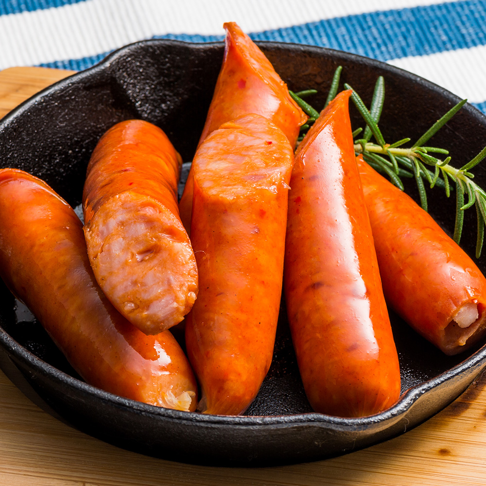 パプリカ、チリペッパー、唐辛子などのスパイスをふんだんに使ったピリ辛の荒挽きポークソーセージ。決して辛すぎない、ほどよいスパイシーさに食が進みます。もちろん、スパイスの風味の素晴らしさは絶品です。