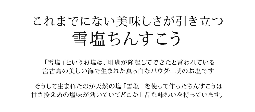沖縄の伝統的なお菓子「ちんすこう」と宮古島の天然地下海水で精製された「雪塩」を組み合わせた南風堂の自信作!一度食べればやみつきになります。今までとは違ったちんすこうの新しい味をお楽しみ下さい。