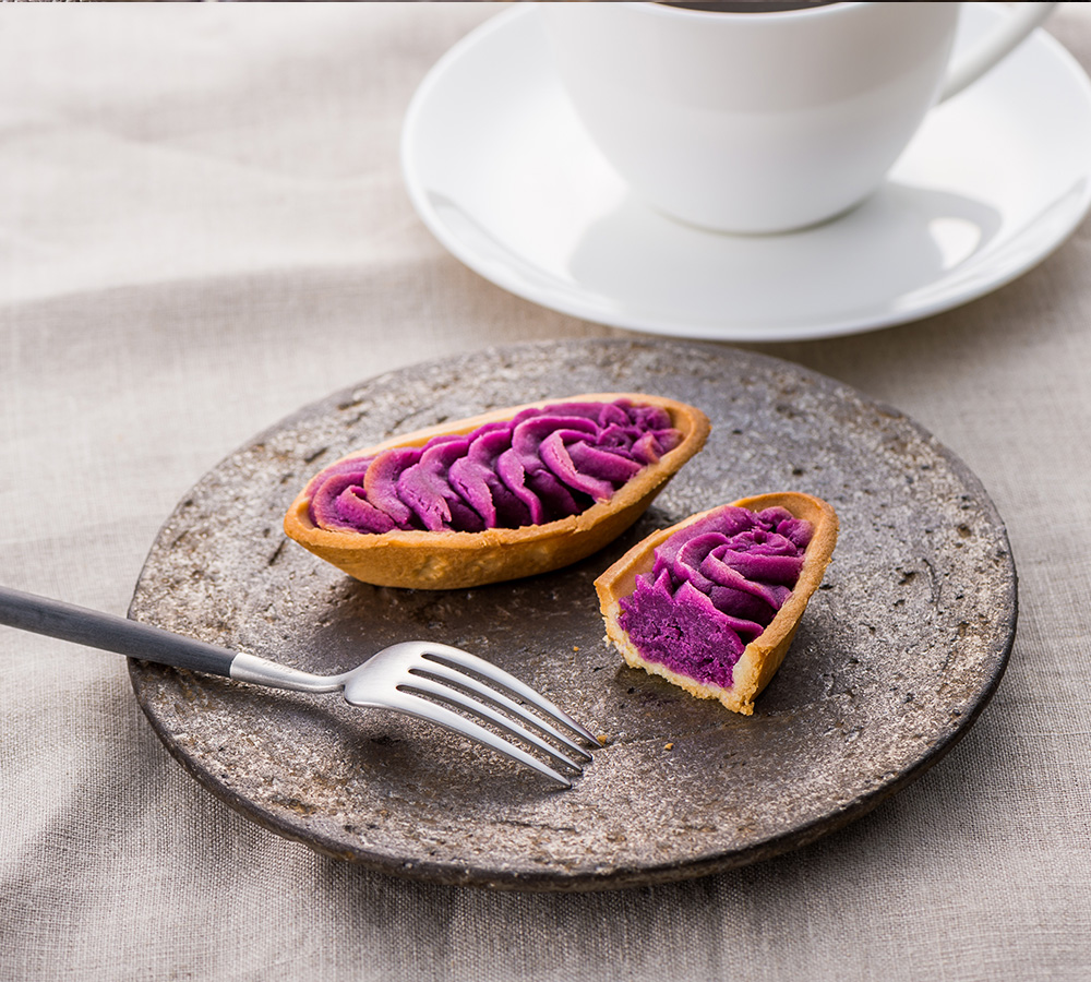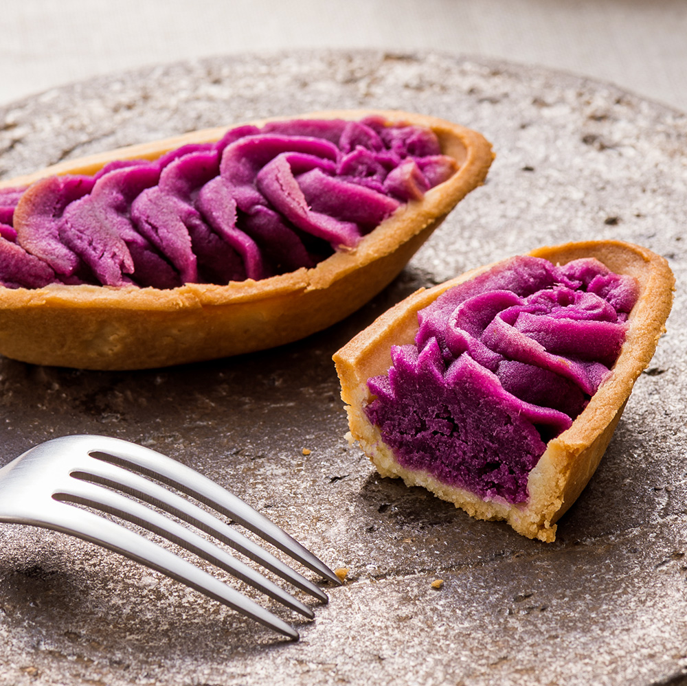 沖縄土産の定番商品。御菓子御殿の紅いもたると。あざやかな紫色の紅イモは沖縄県産100%。紅イモのペーストとタルトの絶妙な組み合わせがお楽しみ頂けます。オーブン、トースターで温めて香ばしい香りが際立ち焼きたての食感をお楽しみいただけます。