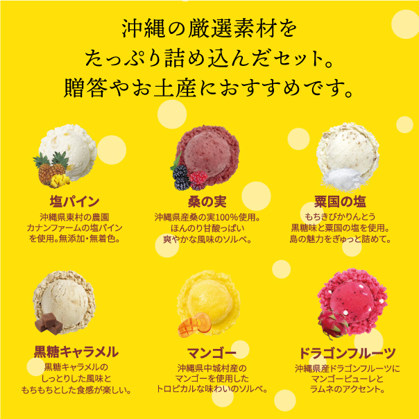 130ml×12個入(カナンファームの塩パイン2個/コクうまっ!AAアイス2個/伊平屋を愛し、アイスを愛す。2個/桑の実ソルベ2個/ティーダの落とした笑顔の種マンG2個/ドラゴンのキス2個)