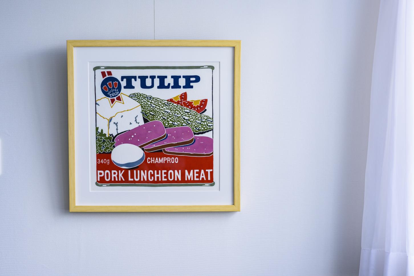 「チューリップ・ポークランチョンミート」は沖縄県民の誰もが愛用している定番の缶詰。島豆腐、ゴーヤ、卵を入れてゴーヤチャンプルーの出来上がり。チャンプルー文化を表現した沖縄らしい作品です。