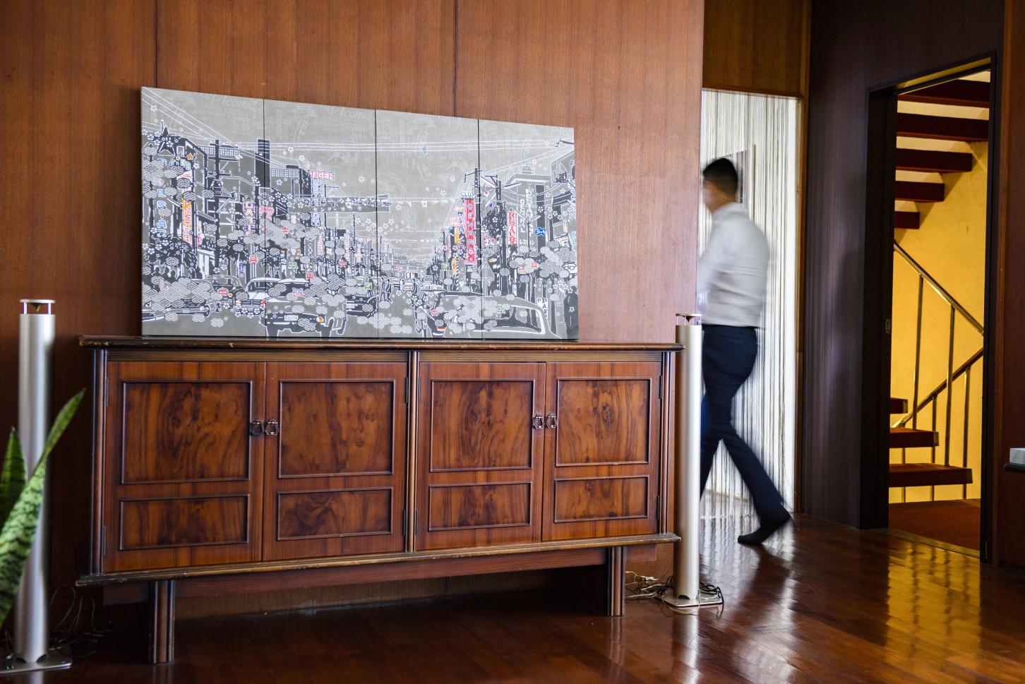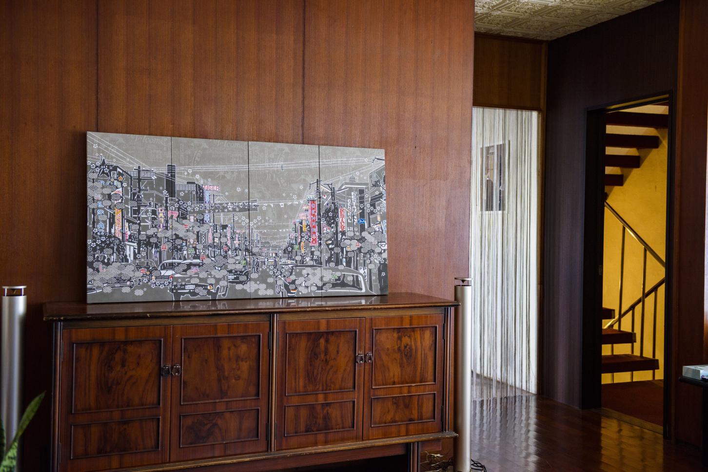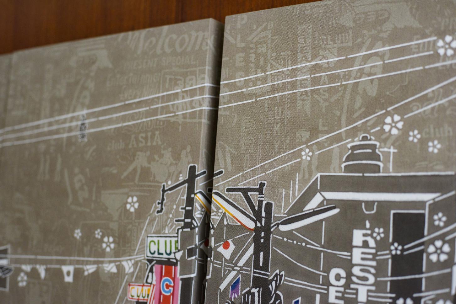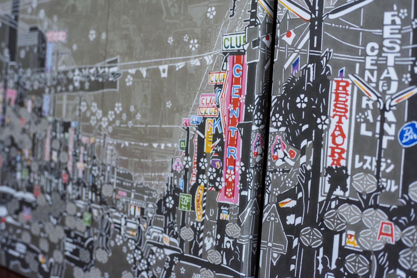 右側を走る車や色とりどりのネオンが輝き、ゲート通りと並ぶ歓楽街。古典模様の七宝繋やAサインマーク、また電線にコウモリも描かれています。