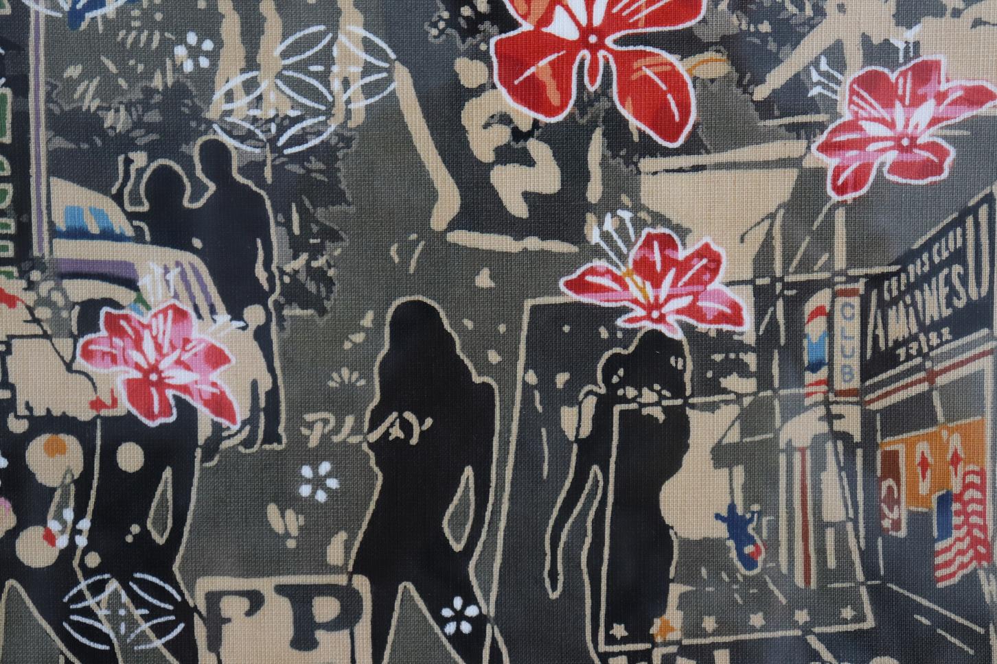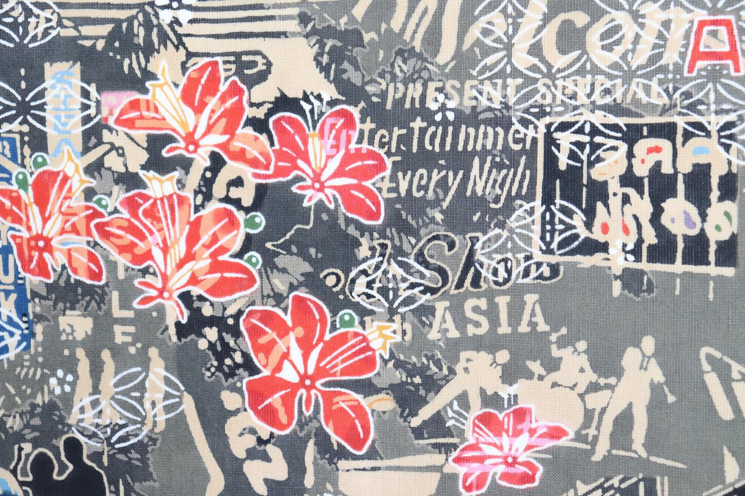 コザゲート通りは、米軍嘉手納の出入り口起点とする通りで、コザの表玄関。70年代から80年代にかけては外国人相手にショーパブが多く営業。色とりどりの看板と、そこに記されている横文字を紅型に取り入れ、見事に染め上げた作品。
