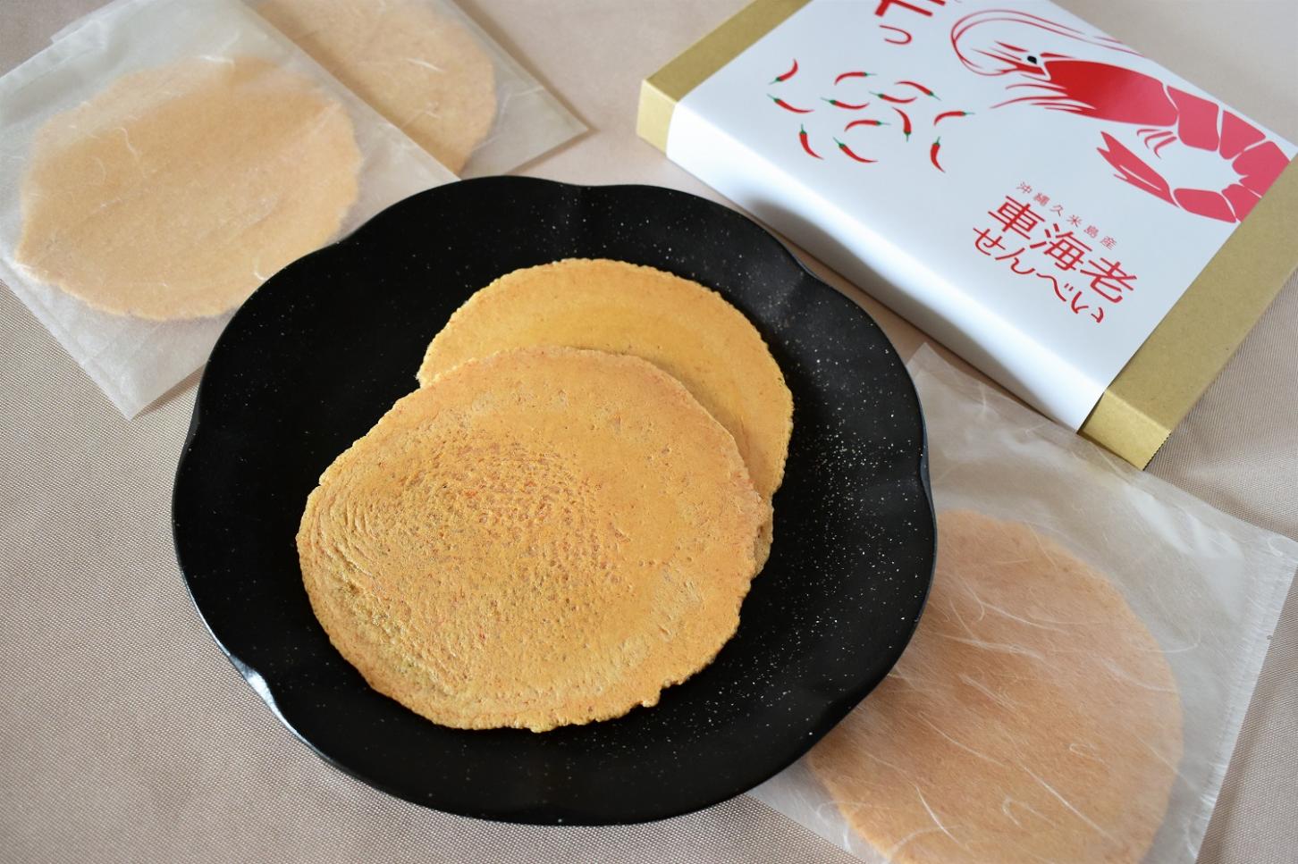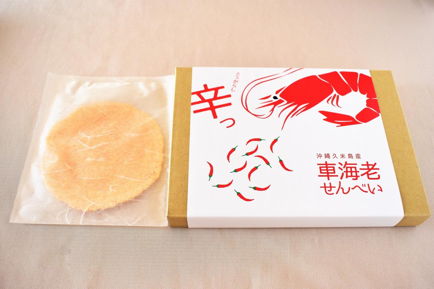 車海老養殖日本一の沖縄県、その車海老養殖の拠点産地に認定されている久米島産車海老を使った大判のピリ辛車海老せんべいです。