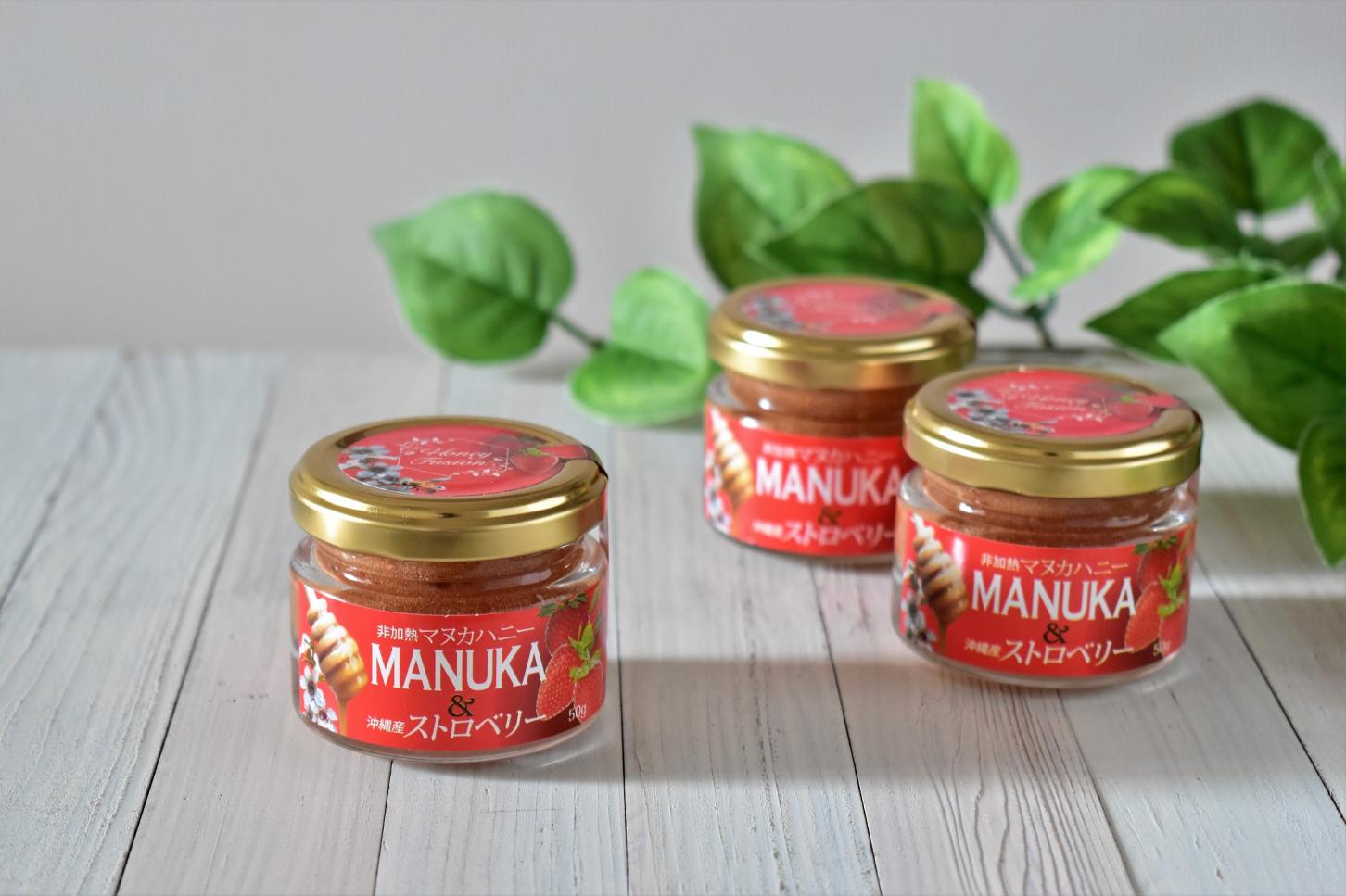 ニュージーランドのみに生息している野生のマヌカ花から採取した非加熱の生のプレミアムマヌカハニーと、沖縄県宜野座村産イチゴのフュージョン(統合)商品。