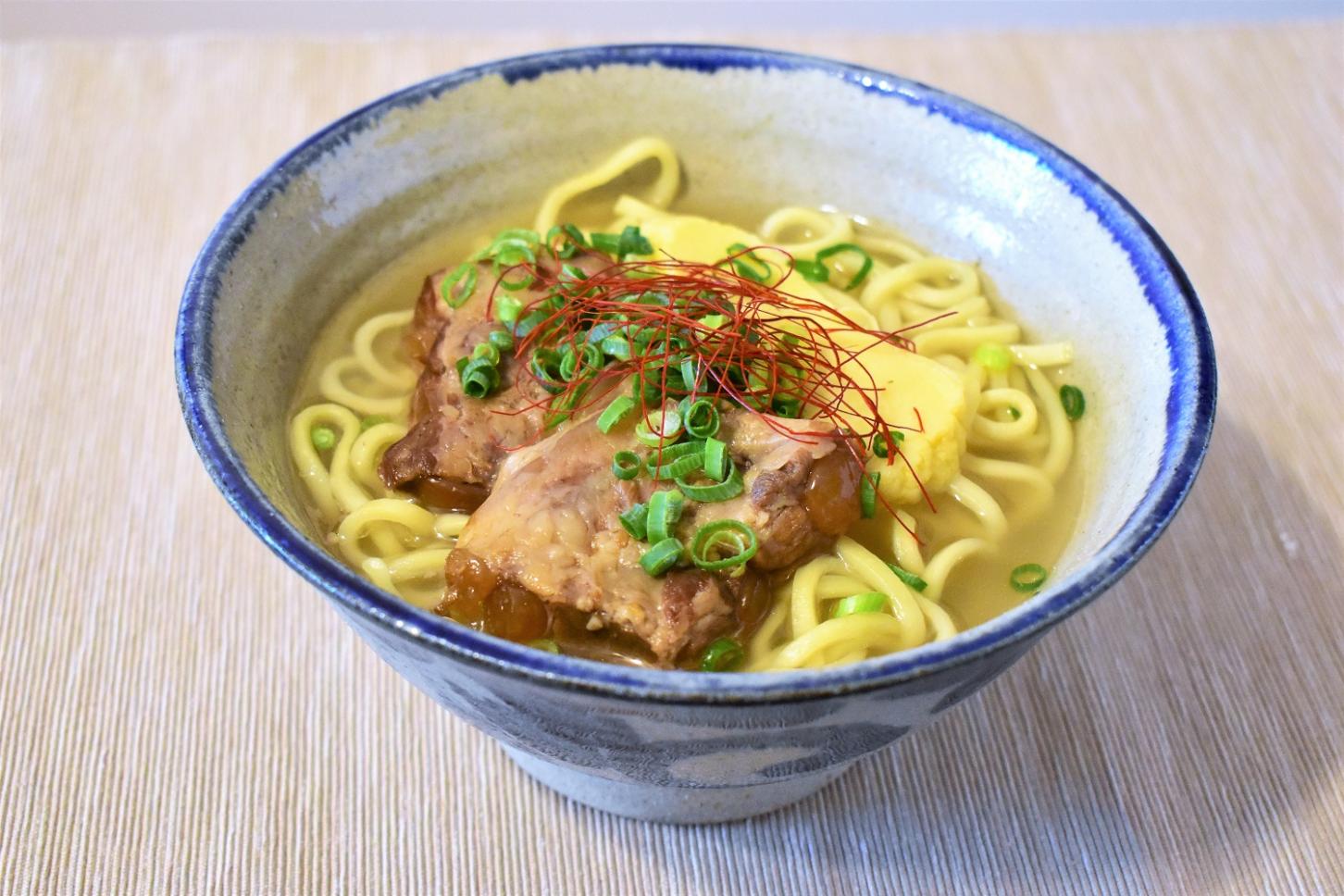 甘辛く煮たソーキ(豚の骨付きあばら肉)や三枚肉(豚バラ肉)、かまぼこ、ねぎなどをのせた沖縄では頻繁に食べられている沖縄そばは、そばに蕎麦粉が使われておらず、小麦粉100%で作られています。