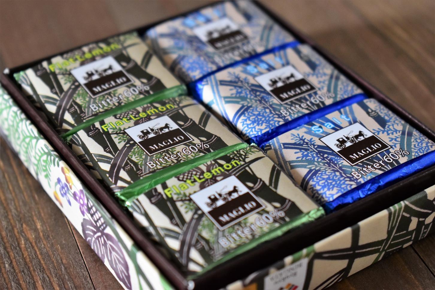 シークワーサーフレーバーチョコレート、塩フレーバーチョコレート、それぞれ6枚入りです。