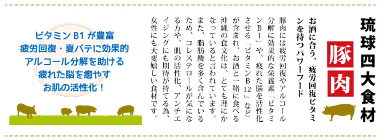 - 豚肉(豚足)、醤油、砂糖、みりん、酒((泡盛)、魚介エキス、おろし生姜、ポークエキス、調味料(アミノ酸等) (原材料の一部に小麦、豚肉、大豆を含む)