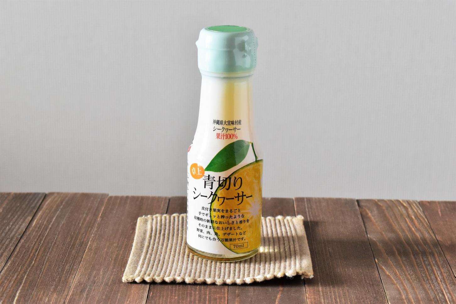 沖縄県産の青切りシークヮーサーを皮ごと搾った、100%ストレート果汁です。