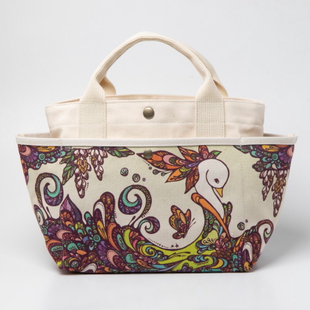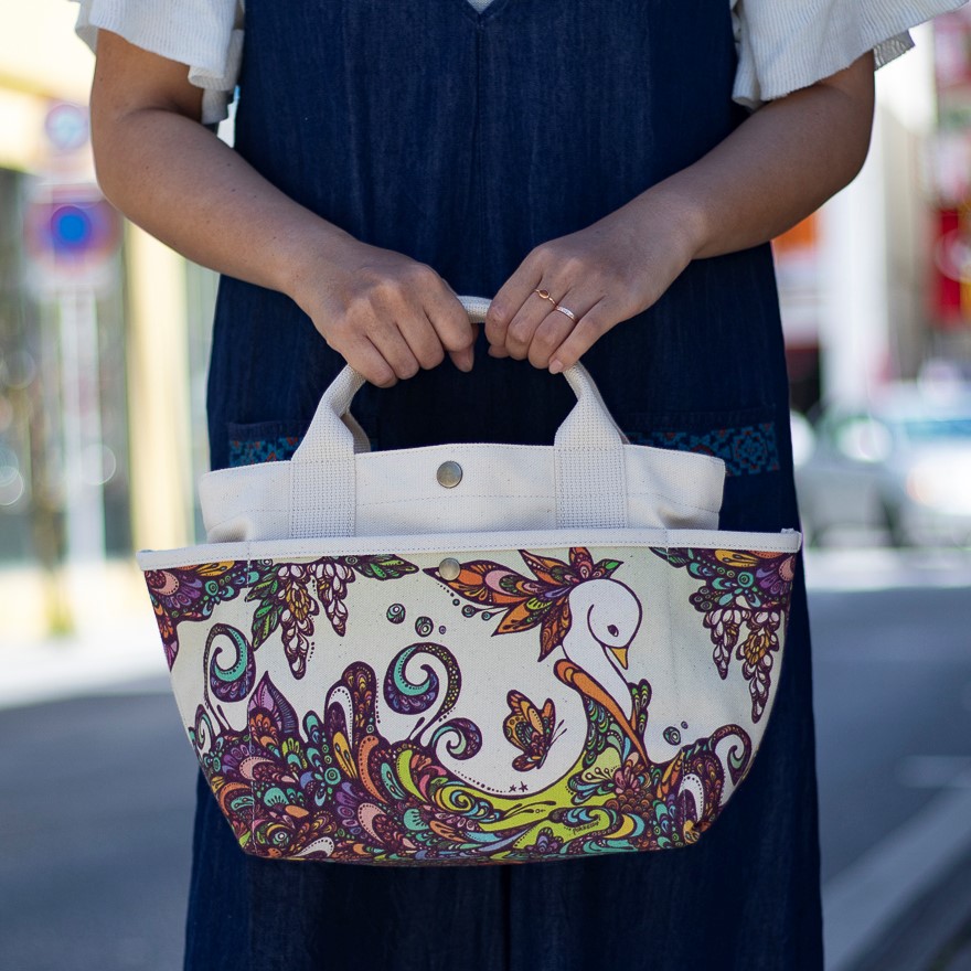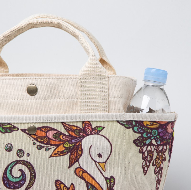 ちょっとしたお出かけにぴったりの使い勝手のいいサイズで、外側には沖縄を代表するイラストレーター・pokke104(池城由紀乃)さんの作品がプリントされています。