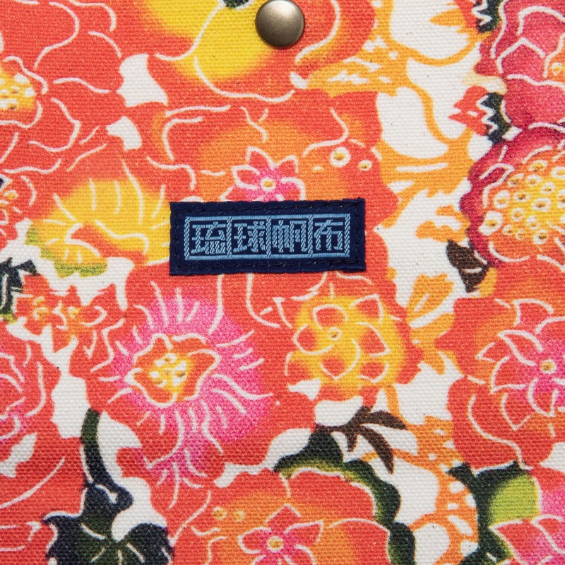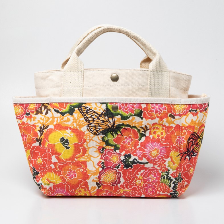 外側と内側に多数のポケットがあり、丈夫さと機能性を兼ね備えたハンドバッグ。ちょっとしたお出かけにぴったりの使い勝手のいいサイズで、外側には沖縄を代表する若手紅型作家・新垣優香さんの色鮮やかな作品がプリントされています。