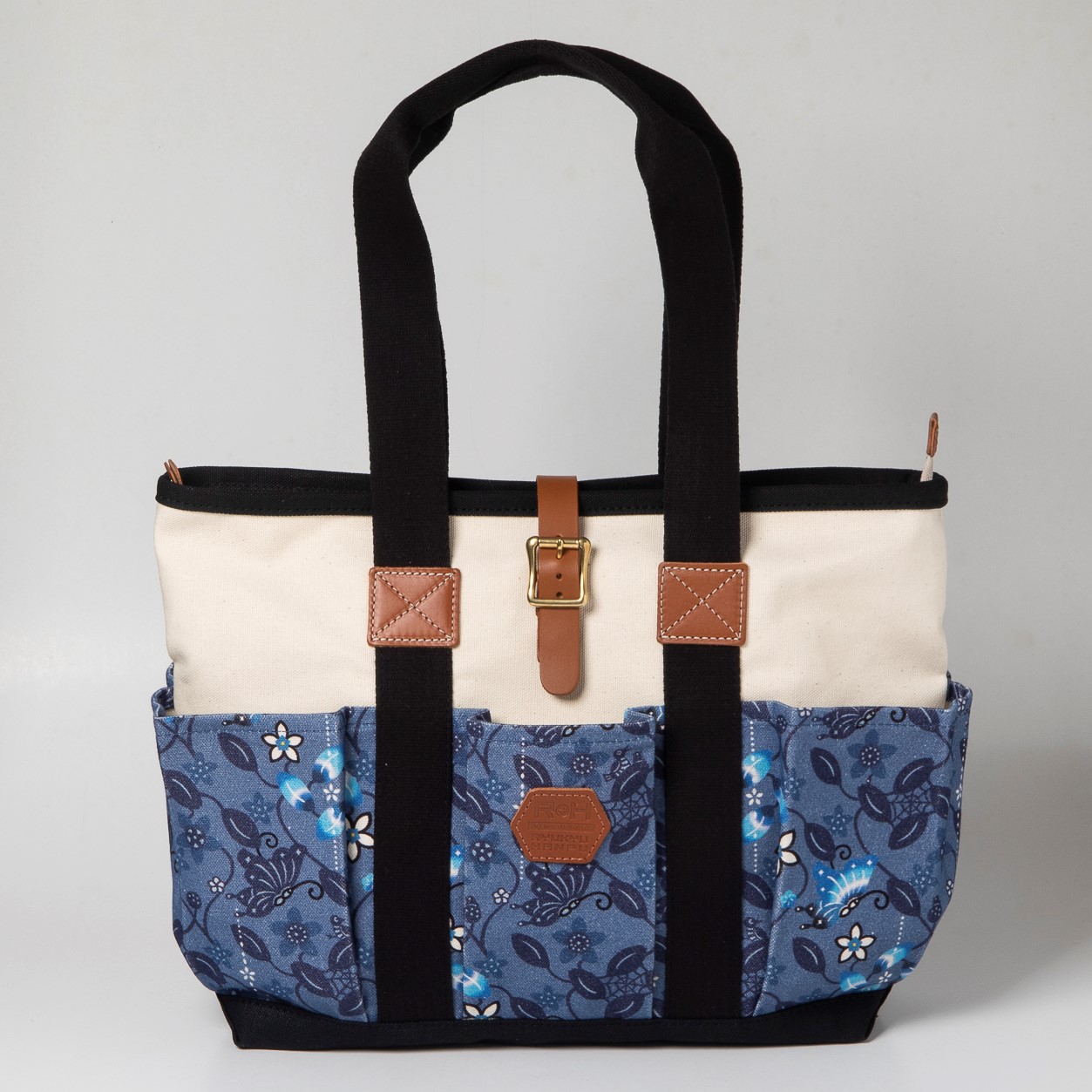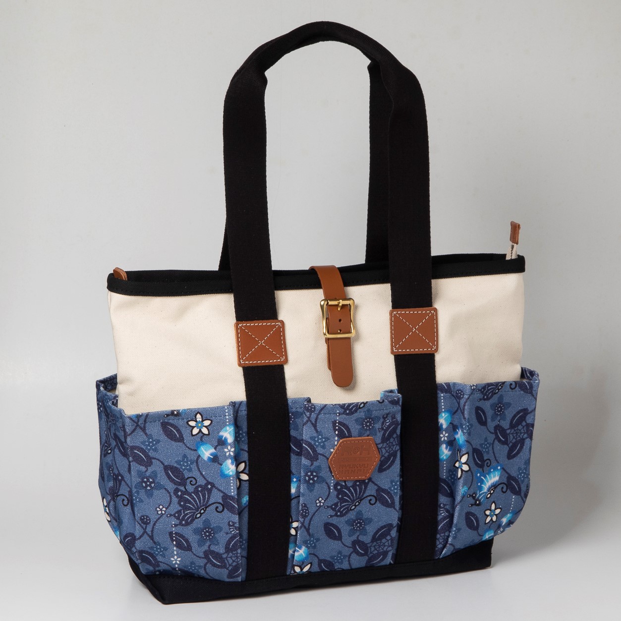 外側と内側に多数のポケットがあり、丈夫さと機能性を兼ね備えたロングハンドル仕様のトートバッグ。