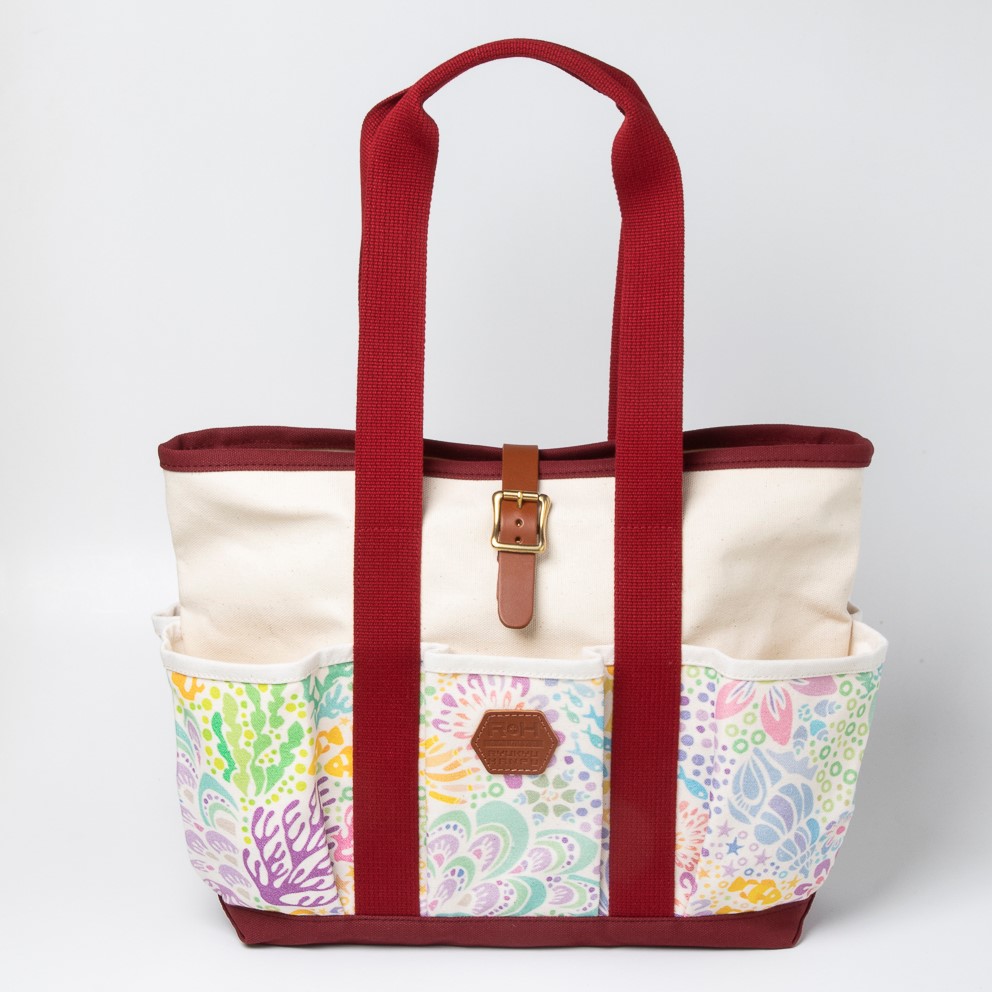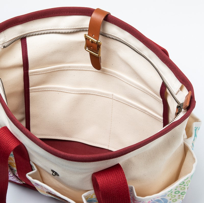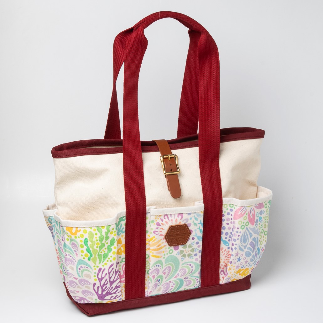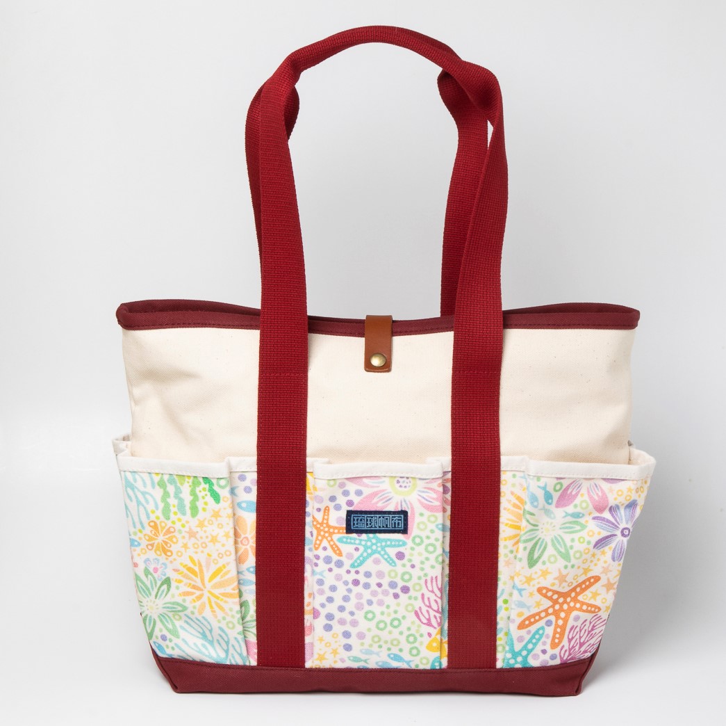 外側と内側に多数のポケットがあり、丈夫さと機能性を兼ね備えたロングハンドル仕様のトートバッグ。ちょっとしたお出かけに十分な収納力で、ママバッグとしても人気です。外側には沖縄の人気イラストレーター・pokke104(池城由紀乃)さんのオリジナリティあふれる作品がプリントされています。