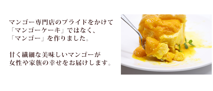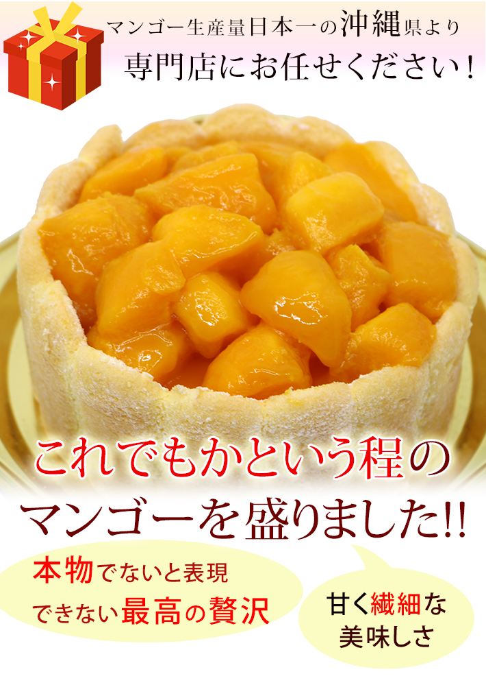 マンゴーレアチーズケーキを土台とし、沖縄県産マンゴー果実をふんだんに飾ったマンゴー好きの方が貰って嬉しいケーキです。