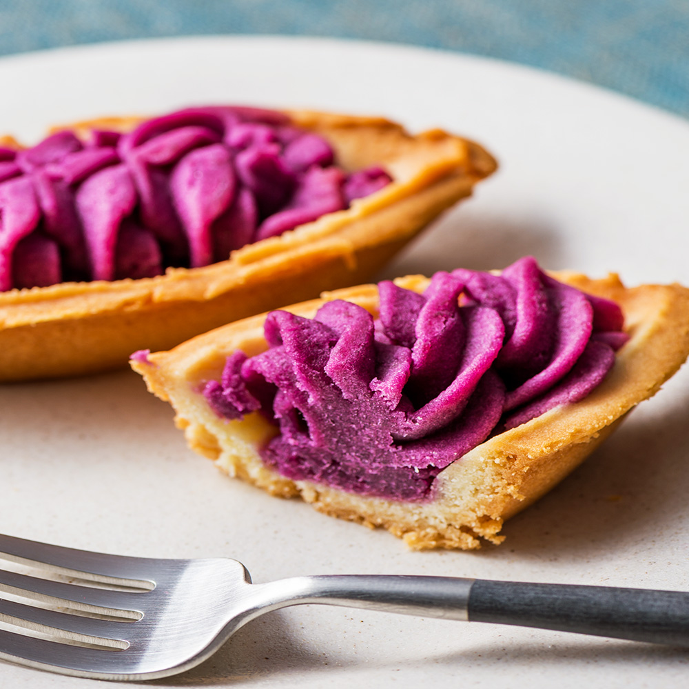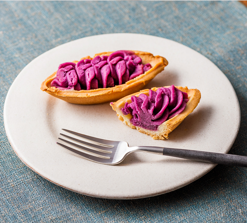 そのまま食べても、もちろんおいしい紅芋タルトなのですが、袋からタルトのみを取り出し、トースターで温めると紅イモの紫色がより鮮やかに、表面は香ばしく、中はほっくりと、さらにおいしくお召し上がりいただけます。